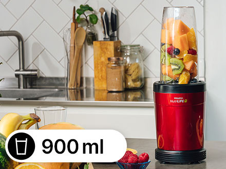 Primera Nutrilife Red ma kubek o pojemności 900 ml — świetny, by przygotować porcje dla całej rodziny.